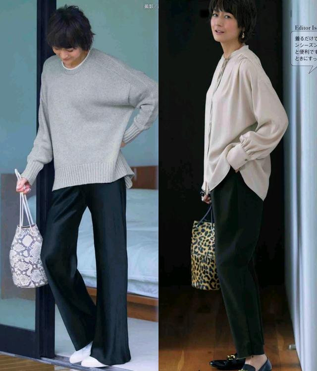 烟管裤是中年女性的穿搭利器,既能修饰腿型,又带有成熟的知性美,大家可以尝试一下休闲的薄款打底衫,或是垂感衬衫搭配烟管裤。