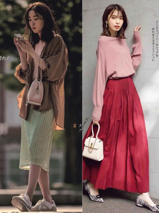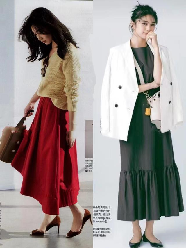 对比色搭配是打破“班味”最直接有效的方法,特别是大地色与复古色的组合,营造出的视觉冲击力能瞬间提升整体造型的时尚度,像是杏色薄款毛衣+红色A字裙的穿法就很值得尝试。